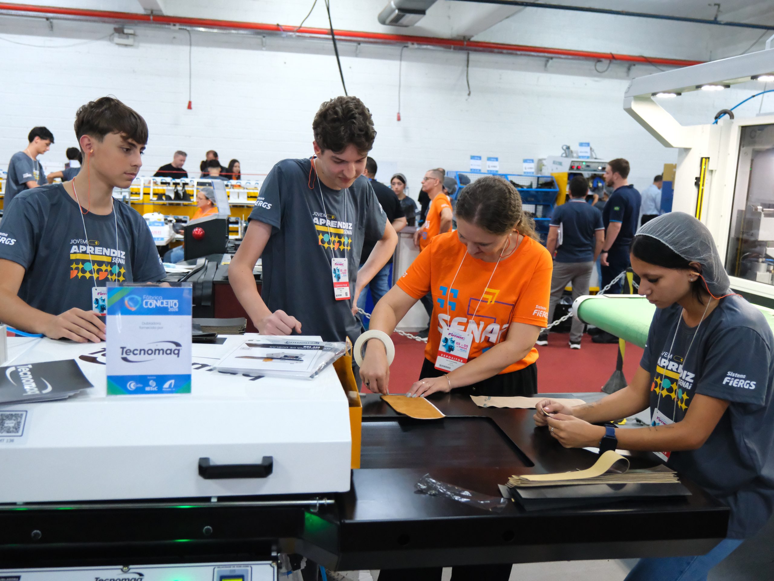 O som das máquinas, o cheiro do couro recém-cortado e a concentração dos estudantes transformam a Fábrica Conceito em um ambiente que vai além da sala de aula. Durante a 49ª Feira Internacional de Couros, Produtos Químicos, Componentes, Máquinas e Equipamentos para Calçados e Curtumes (Fimec), 124 alunos do Serviço Nacional de Aprendizagem Industrial (Senai-RS), integrante do Sistema FIERGS, assumem, junto dos instrutores, a operação do espaço da entidade enquanto produzem mil pares de calçados diante dos visitantes, vivenciando, na prática, a rotina de uma indústria do setor calçadista.