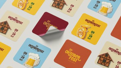 Ícones ilustrados manualmente, com traços leves e orgânicos, representam símbolos festivos, incluindo chapéu típico, pretzel, caneco de chopp, instrumento musical, lebkuchenherz e arquitetura enxaimel. A assinatura gráfica, por sua vez, equilibra robustez e leveza, com organização visual mais limpa, uso estratégico de boxes informativos e harmonia cromática.