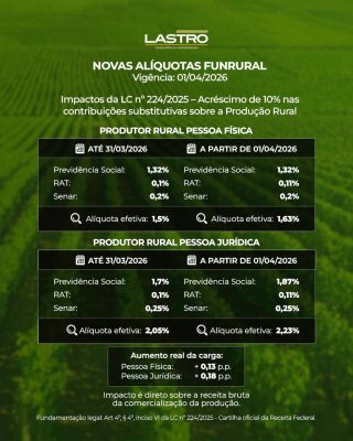 Segundo Viviane Morales, advogada, sócia proprietária e diretora Administrativa e Financeira da Lastro Soluções Tributárias para o Agro, a alteração impacta diretamente os produtores que utilizam a receita bruta como base de cálculo da contribuição. “Na prática, a alíquota efetiva do produtor rural pessoa física sobe de 1,5% para 1,63% sobre a receita bruta da comercialização. Já para o produtor rural pessoa jurídica, a alíquota passa de 2,05% para 2,23%. O aumento real da carga corresponde a 0,13 ponto percentual para pessoa física e 0,18 ponto percentual para pessoa jurídica”, explica.